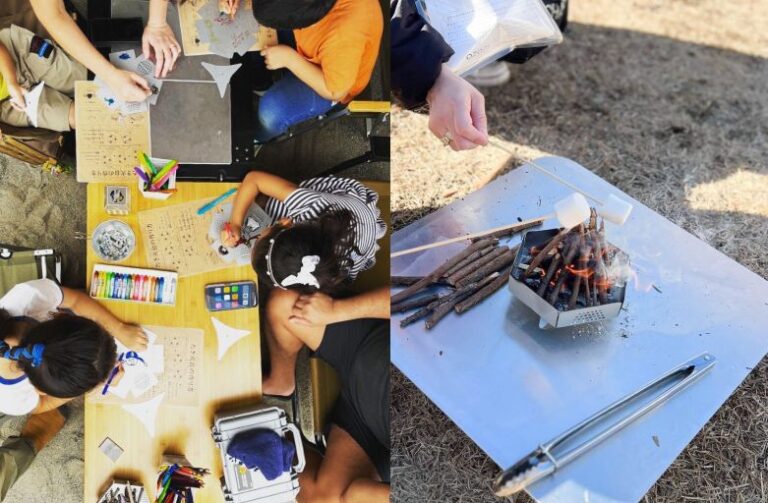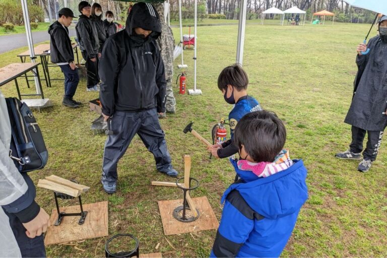 山奥など電力がない環境での火付けは手間がかかりますが、これもキャンプの醍醐味!ココではスタッフが傍につき安全に火をおこせます!更に、金属を折り紙のように折り曲げて小さな焚き火台を作るワークショップも!お子様と一緒に楽しく金属工作を学べます。